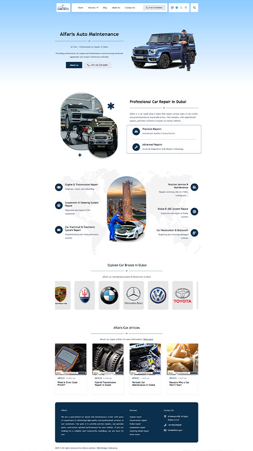 طراحی سایت Alfaris به سفارش مدیر این مجموعه توسط واحد طراحی وب سایت دهاستینگ انجام شده است. وب سایت Alfaris یا الفاریس یک وب سایت تعمیرگاه خودرو در دبی می باشد که خدمات تعمیرات متنوعی بر روی جدیدترین خودرو ها با تکنولوژی های روز دنیا برای افراد داخل این کشور ارائه می دهد.